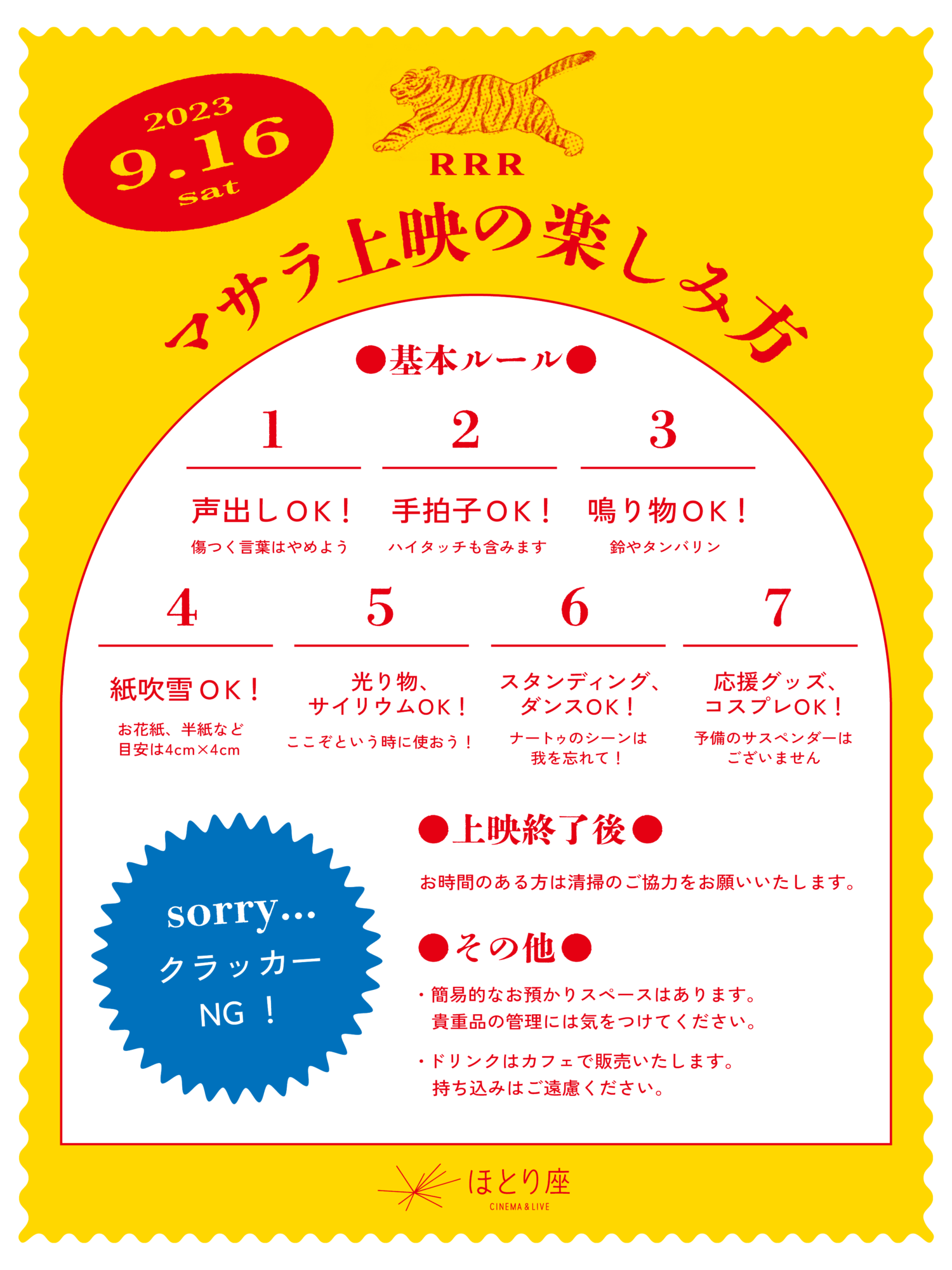※ゆっくりご鑑賞をお楽しみいただきたい方は、別日のご鑑賞もしくは意を決してマサラ上映に飛び込んでみてください!マサラ上映を盛り上げるグッズ、お供え物などのお持ち込みや郵送などに関しましては当館までご相談ください(担当:瀬尾)